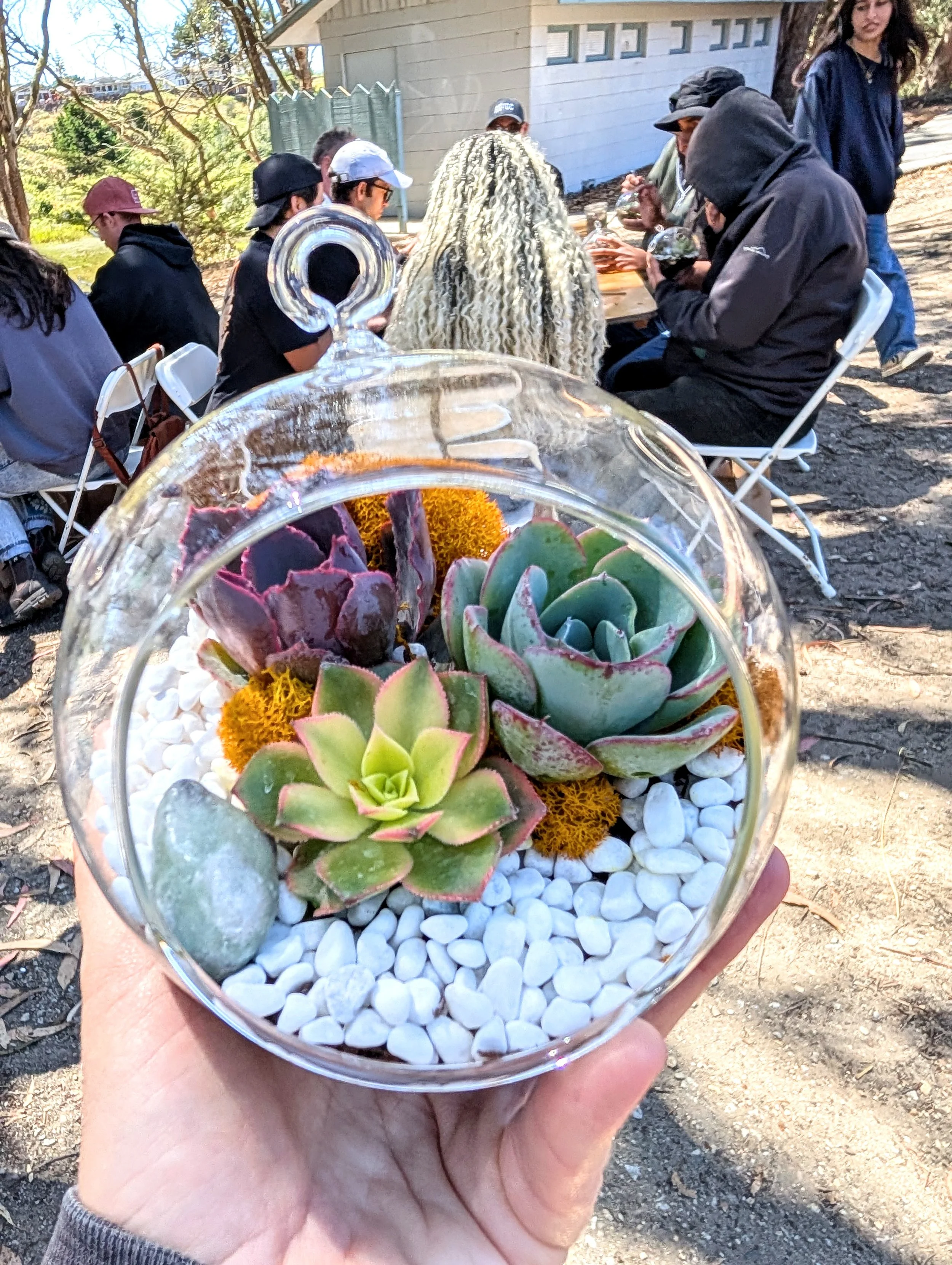 A Workshop, which lasts 1 1/2 hours and features a thorough discussion of succulent care, a demonstration, and a larger, more complex terrarium. Ideal for groups of 10-50 people.
