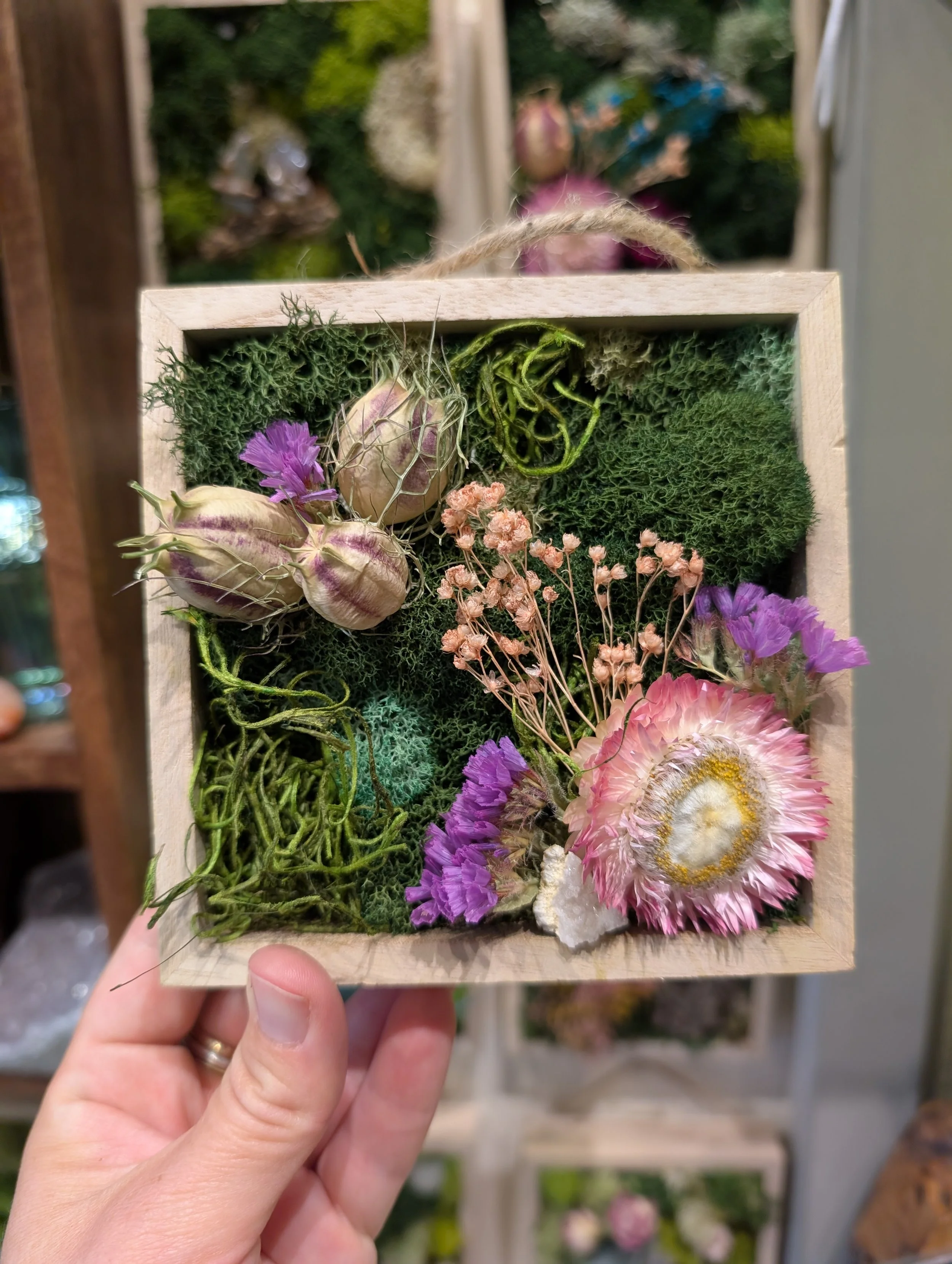 A Workshop, which lasts 1-1.5 hours and is ideal for groups of 10-50 people. Larger groups can be accommodated. Each person makes a 5” or 8” square moss wall to keep at their desk or hang on a wall at home